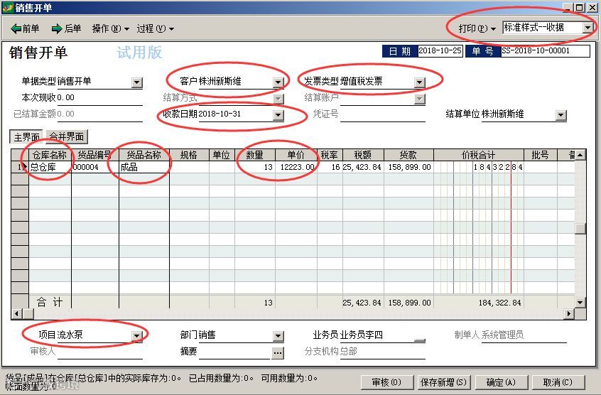 打开销售开单录入界面,逐个录入销售开单相关信息: