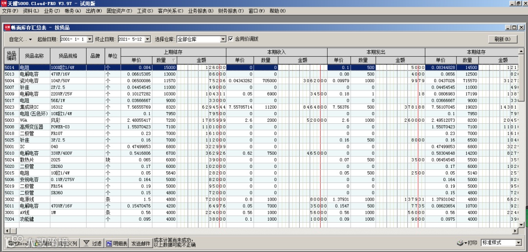 可以一目了然知道货品的当前成本和收发结余,点击货品还可以切换明细记录表