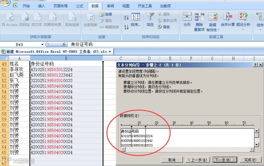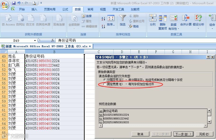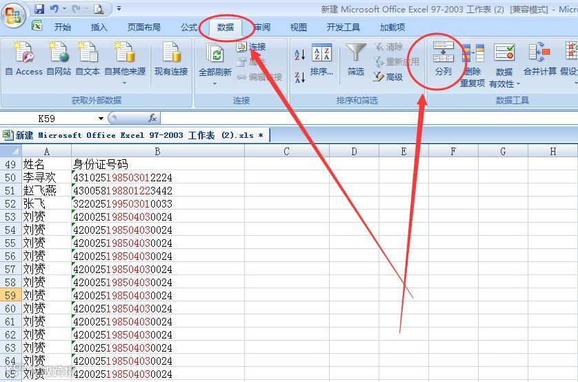 如下图,我们需要提取每个身份证的出生年月日到后面一列。就可以通过EXCEL的分列功能快速做到。