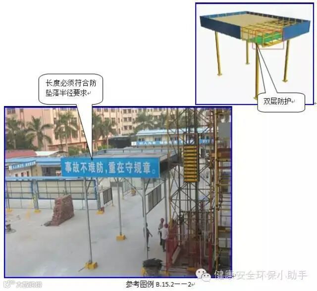 3、安装位置不满足防坠落半径规范的顶部应加设防护顶棚。