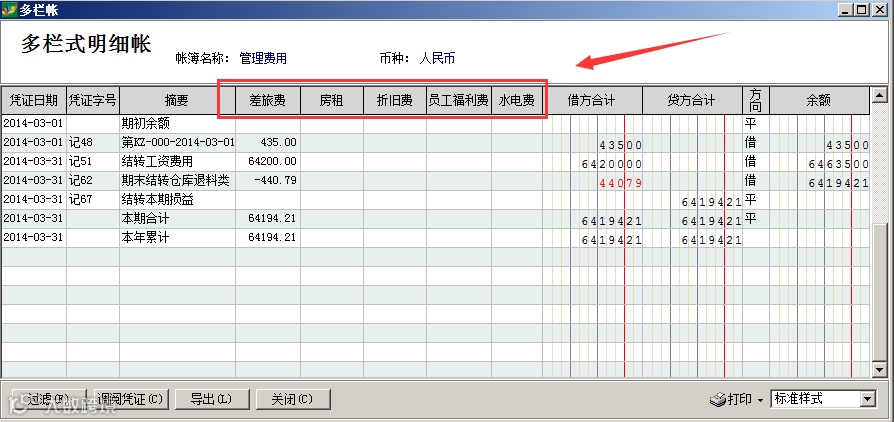 (通过以上报表,我们可以看到管理费用科目2014年3月期间每个科目的发生额)