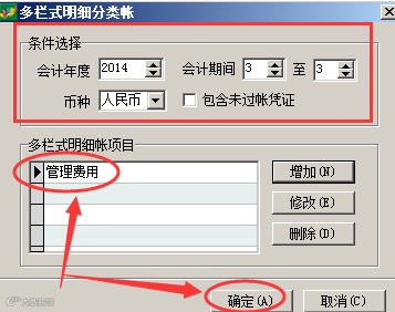 1、点击增加 2、选择需要查询的科目 3、自动编排明细 4、自动编排后确定 5、设置条件后,点击对应科目确定打开多栏账
