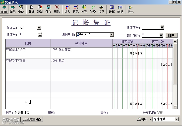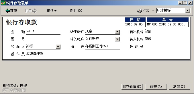 银行存取款单制作后,转入账户资金增加,转出账户减少。同时财务可以选择生成财务凭证。