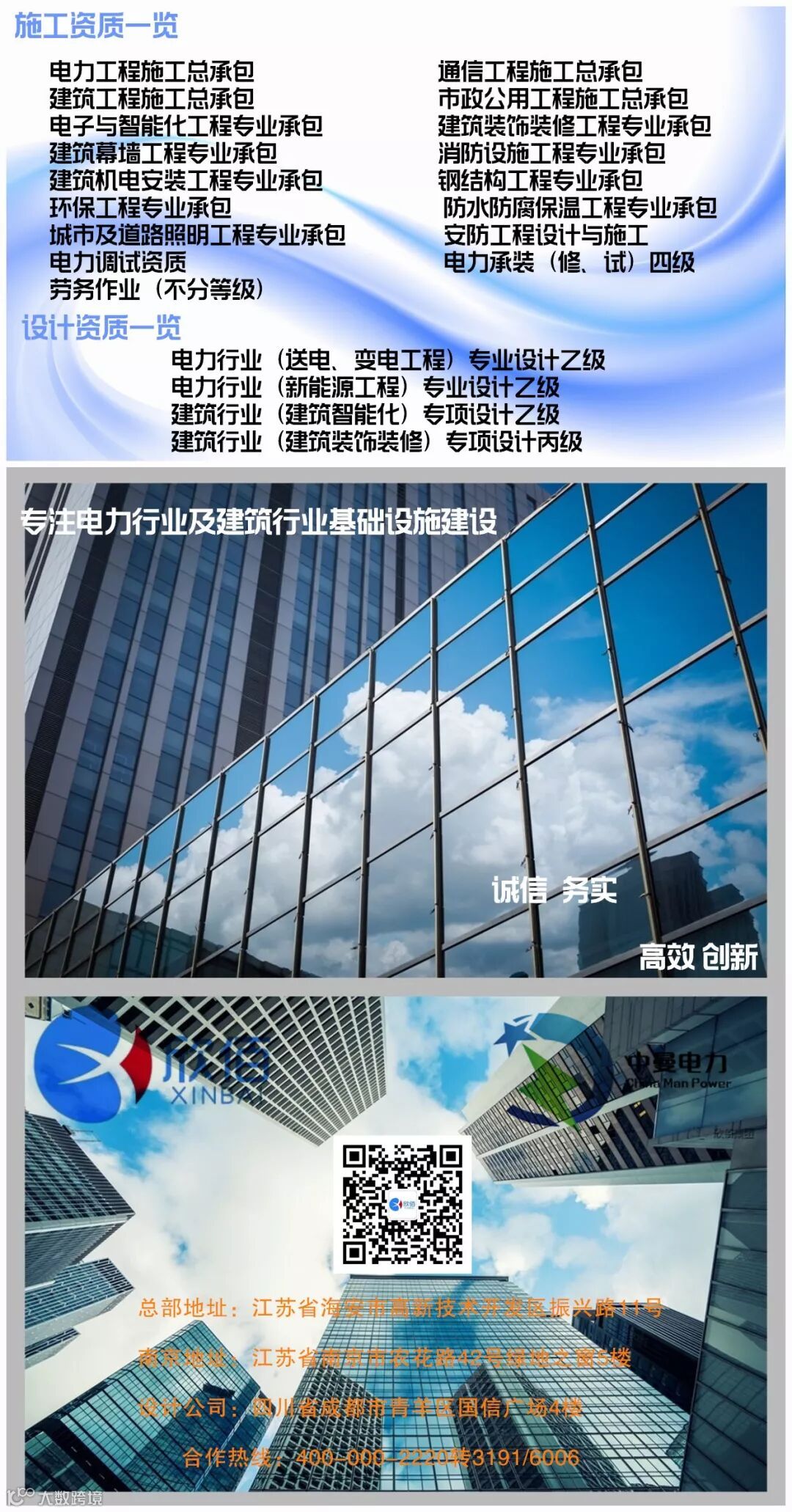 本着“诚信、务实、高效、创新”的经营理念,江苏欣佰建设工程有限公司&中曼电力科技有限公司(欣佰集团)面向全国寻找战略合作伙伴,共拓市场,欢迎来电垂询!