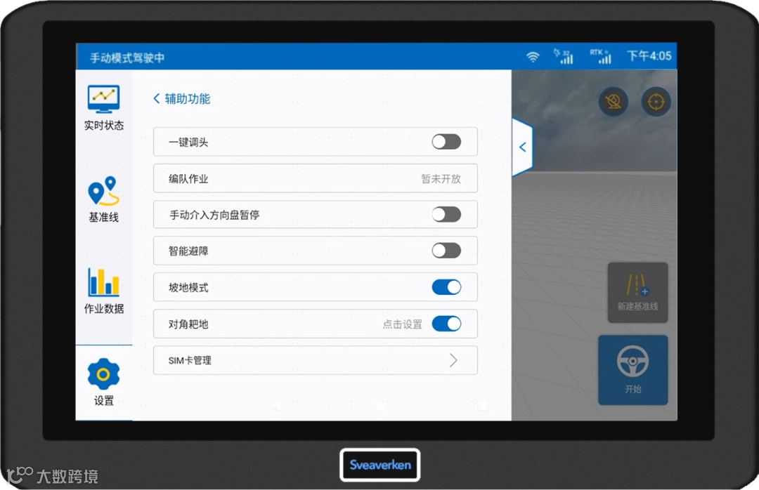 开启方式:点击设置-选择辅助功能-开启坡地模式/对角耙地/U型转弯/超低速