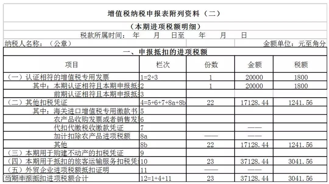 【案例】某企业为增值税一般纳税人,2019年4月购进按规定允许抵扣的国内旅客运输服务。取得1份增值税专用发票,金额20000元,税额1800元;取得增值税电子普通发票、航空、铁路、其他客票共22份,金额合计17128.44元,税额合计1241.56元。填报如下: