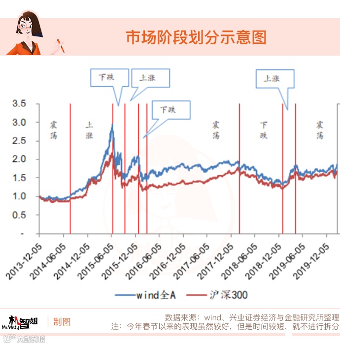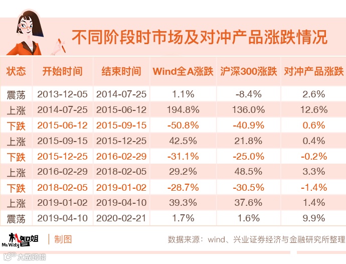从结果来看,在市场下跌的区间内,公募对冲产品的表现都较为稳定(如下图),且都显著跑赢沪深300和wind全A的同期表现。即便在震荡市(2013年底至2014年7月以及2019年4月至2020年2月),对冲产品的业绩也稳定优于市场表现,可见此类产品确实有一定的风险对冲作用。