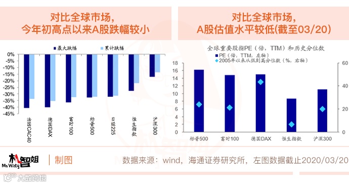 另外对比全球,作为价值洼地的A股在疫情冲击下跌幅度较小的同时,估值也相对较低。例如跟美股相比,标普500PE当前(截至2020.3.20)为16.2倍,仅小幅低于2005年以来的均值18.7倍。反观A股,沪深300PE当前为11.1倍,大幅低于2005年以来的均值16.5倍。可见,从相对和绝对估值看,A股都明显低于美股,估值优势明显。