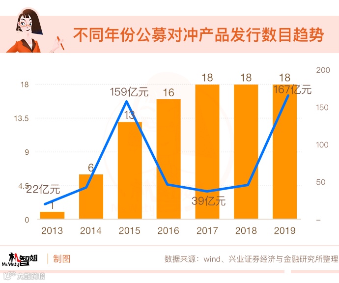 另外,随着国内基金品种的不断丰富,某些类型的公募基金在一定程度上也可以充当散户配置“避险资产”的角色。比如能很好对冲系统性风险,力争实现稳定收益的公募对冲类产品。此类产品在2013年拉开发展序幕,截至2019年底,我国目前存量公募对冲产品规模达到167亿元。(数据来源:兴业证券)