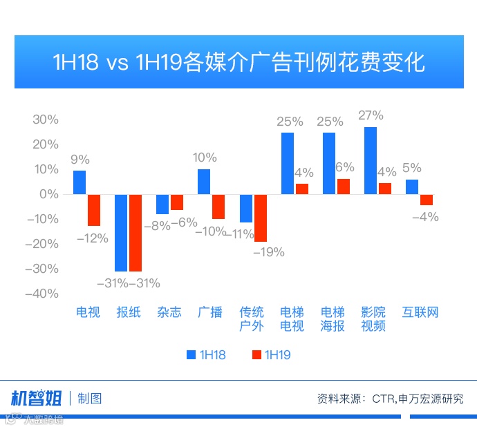 不过别看电梯广告洗脑,不少广告主对电梯广告还是青睐有加。根据CTR数据(央视市场研究)显示:近3年广告市场增速第一的竟不是互联网,而是电梯媒体。同时,即使在2019年一季度,受到经济大环境影响,各主流媒介广告刊例的花费普降或减速的背景下,电梯电视、电梯海报的花费同比分别有4.1%、6.2%的小幅增长。