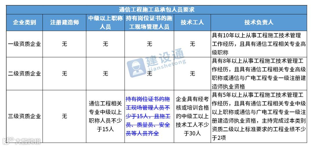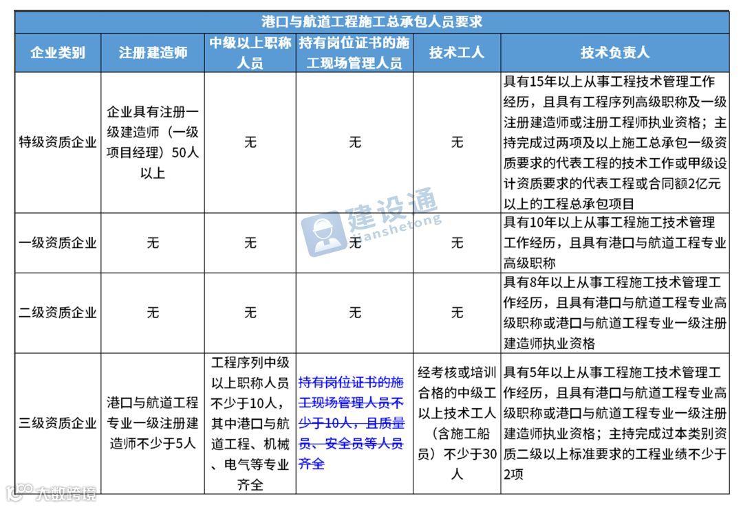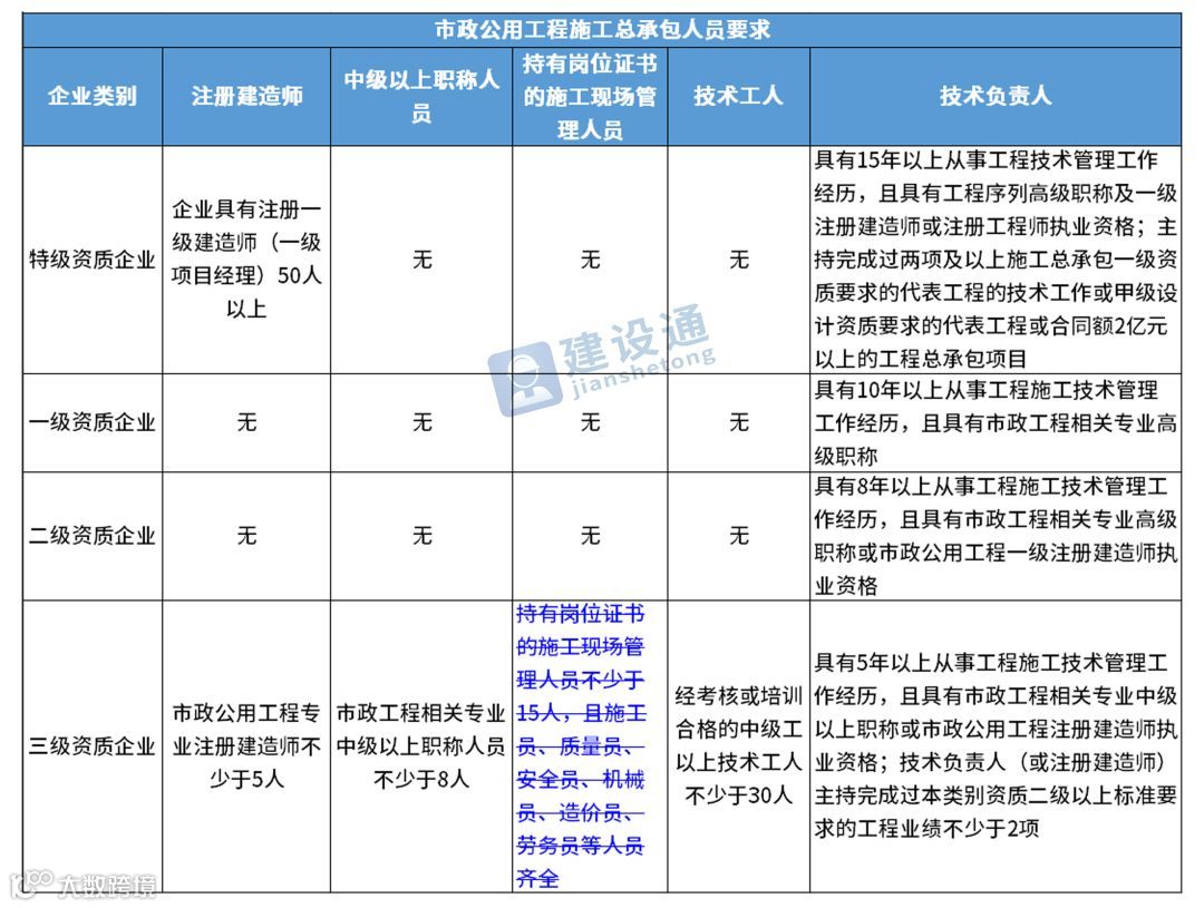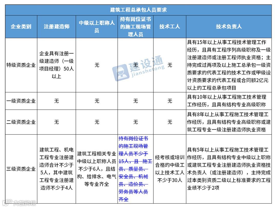 换句话说,并不是所有企业资质都不要求有建造师等企业人员。施工总承包三级资质企业对建造师等人员仍有要求,一级资质、二级资质企业保留技术负责人这一项要求,特级资质另有规定。
