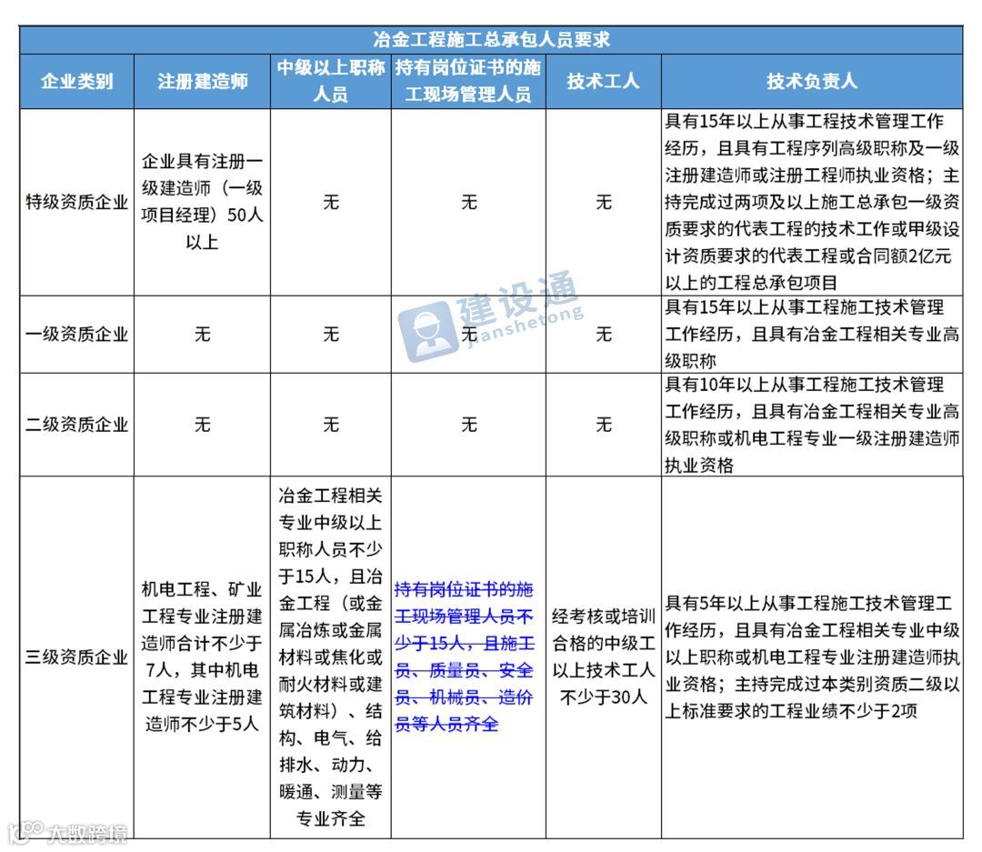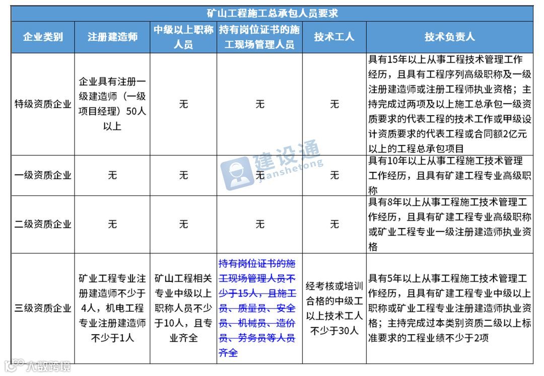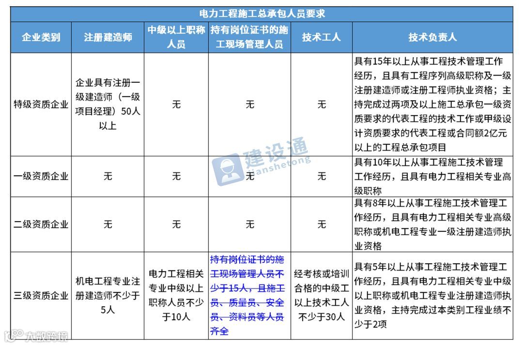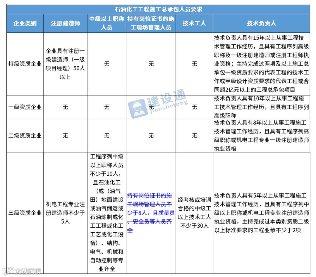 换句话说,并不是所有企业资质都不要求有建造师等企业人员。施工总承包三级资质企业对建造师等人员仍有要求,一级资质、二级资质企业保留技术负责人这一项要求,特级资质另有规定。