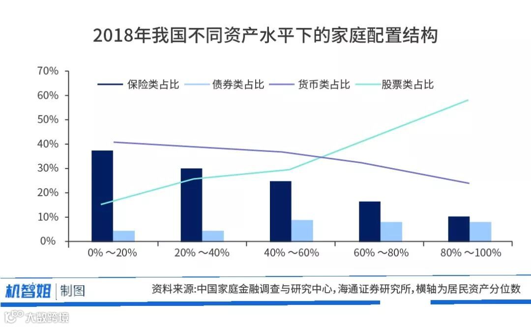 这个,咱们可以跟有经验的人取取经。《2018中国城市家庭财富健康报告》显示,资产水平较高的家庭,往往资产管理意识更强,更青睐高收益高风险资产。所以正如下图所示,未来随着居民可支配收入的进一步上升和财富增值需求的叠加,会有越来越多的居民选择增配证券类金融资产。