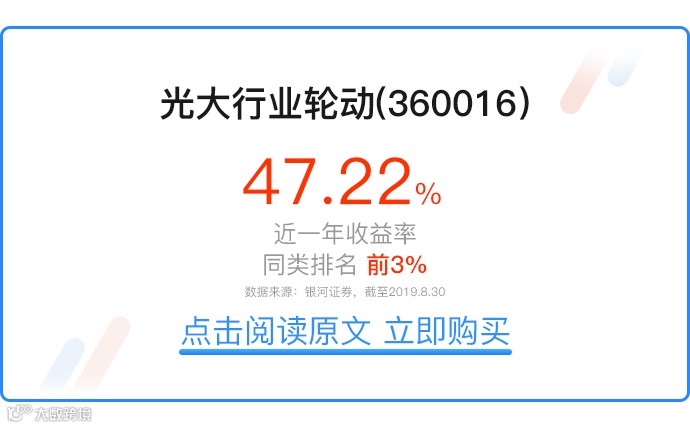 基于对市场趋势的预判以及投资逻辑的不断完善,由董伟炜管理的光大行业轮动基金(360016)表现抢眼:今年以来涨幅50.42%,最近一年收益在391只同类基金中排名第9,远超大盘表现。(银河,2019.8.23)