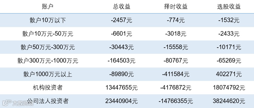 最近一则来自上海证券交易所的数据(下表)可谓是引爆了市场,该数据显示, A股的个人投资者,无论你是10万以下的“重在参与型”选手,还是1000万以上的“资本大佬”,在2016年1月-2019年6月这段时间内的总收益为负,可谓是“白忙活一场”。然而,反观机构及公司法人投资者却结结实实的在这段时间内实现了正收益,专业投资人就这样轻松实现了对个人投资者的收益碾压。但当我们细品这则数据时,我们也可以发现就“择时收益”而言,无论你是个人投资和还是专业投资者,在这3年半的时间内择时收益都是负数!这个结论不免让人有些震惊,但血淋淋的现实告诉我们,我们自认为很精准的择时其实并不能带来正收益。