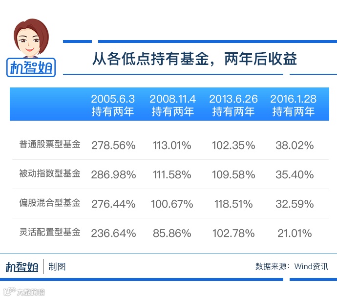 再来看具体基金,从各低点持有基金,两年后收益怎么样呢?