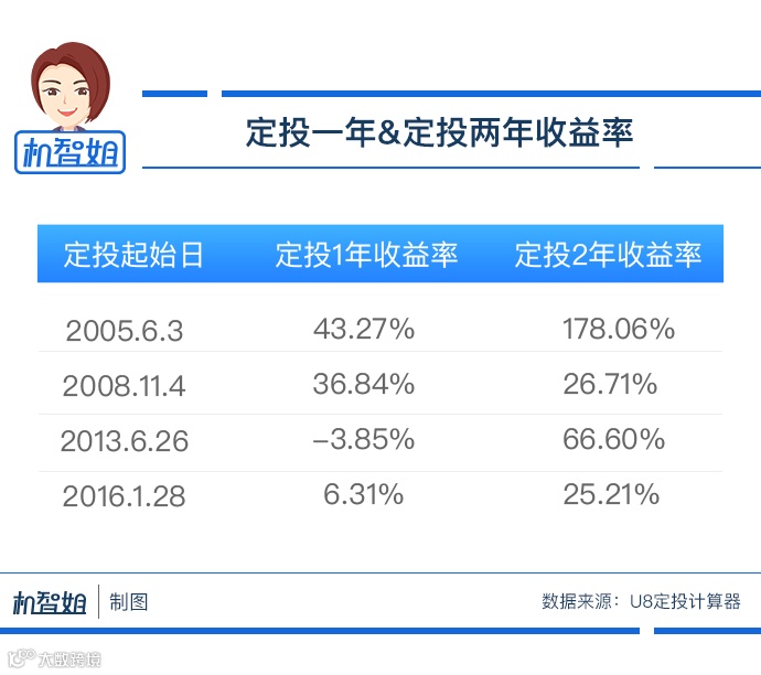 直接来看数据,假设从上述估值低点开始定投沪深300指数,每个月定投1000元,看看定投一年和定投两年收益各如何。