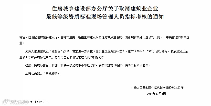 为深入推进建筑业“放管服”改革,决定进一步简化《建筑业企业资质标准》(建市〔2014〕159号)部分指标,取消建筑业企业最低等级资质标准中关于持有岗位证书现场管理人员的指标考核。