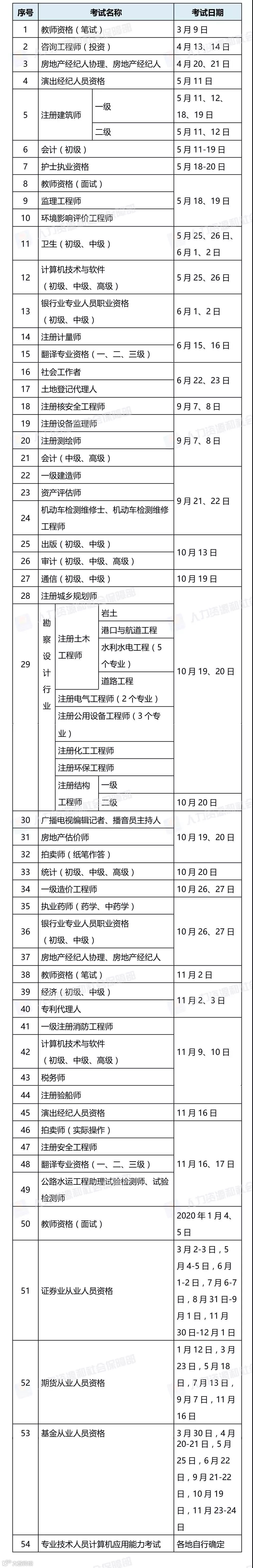 人社部印发通知,公布2019年度专业技术人员资格考试工作计划。比如教师资格(笔试)是在3月9日,会计(初级)是在5月11-19日。