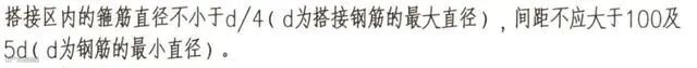 搭接区内的箍筋直径不小于d/4( d为搭接钢筋的最大直径) ,间距不应大于100及5d( d为钢筋的最小直径)。
