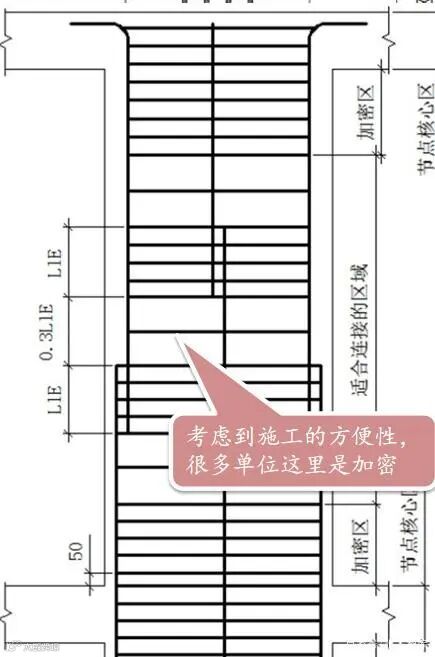 很多施工单位实际施工时,上下的搭接处是加密的,错开处考虑施工的便捷性,也给做成加密的。