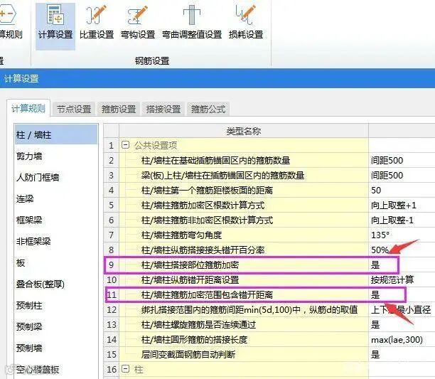 软件柱子设置中,分别在9条和11条,默认搭接处和搭接错开处箍筋都是加密的。