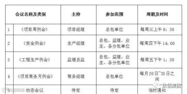 2)各类动态会议制度视项目需要随时召开,一般情况下发起方将通过有效方式至少提前一天通知相关方。凡无故迟到者、无故缺席者进行处罚(有详细处罚标准)。分包单位主要管理人员如遇到特殊情况无法参加的会议的,需向总包项目经理提交纸质假条。