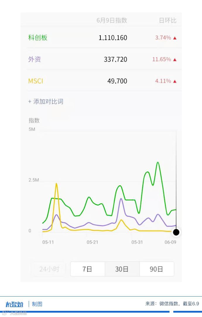 从微信指数来看,今天科创板一直占据话题C位。科创板号称“中国版的纳斯达克”,对比美国,苹果、英特尔、亚马逊等一批科创牛股,带动纳斯达克指数过去十年牛市行情的刺激,很多投资者跃跃欲试,想从中分得一杯羹。