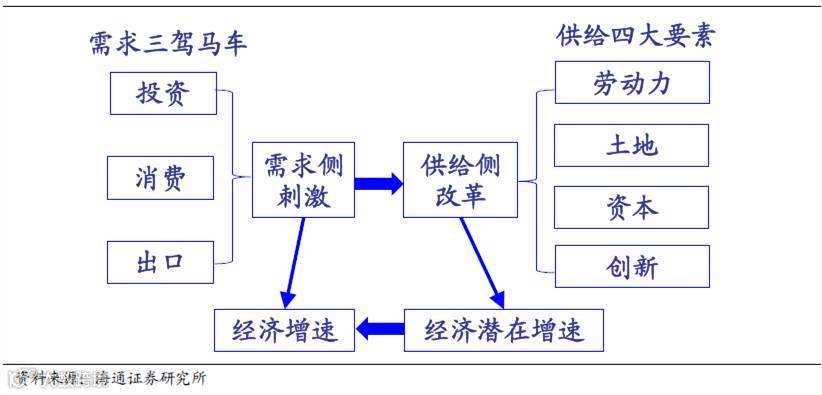 供给侧:劳动力、土地、资本、创新四大要素,四大要素在充分配置条件下所实现的增长率即中长期潜在经济增长率。