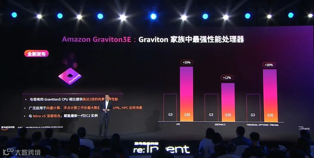 亚马逊云科技第二个自研芯片是Graviton,这是一款基于Arm的通用处理器,相比x86具有更高的能效比。去年,亚马逊云科技推出第三代Graviton,今年再进一步推出了Graviton 3E 处理器,其专门为浮点和向量指令运算而优化,主要面向高性能计算工作负载。相比于 Graviton 3实例,Graviton 3E 在 HPL(线性代数的测量工具)上性能提升35%,在 GROMACS(分子运动)上性能提升 12%,在金融期权定价的工作负载上性能提升 30%。