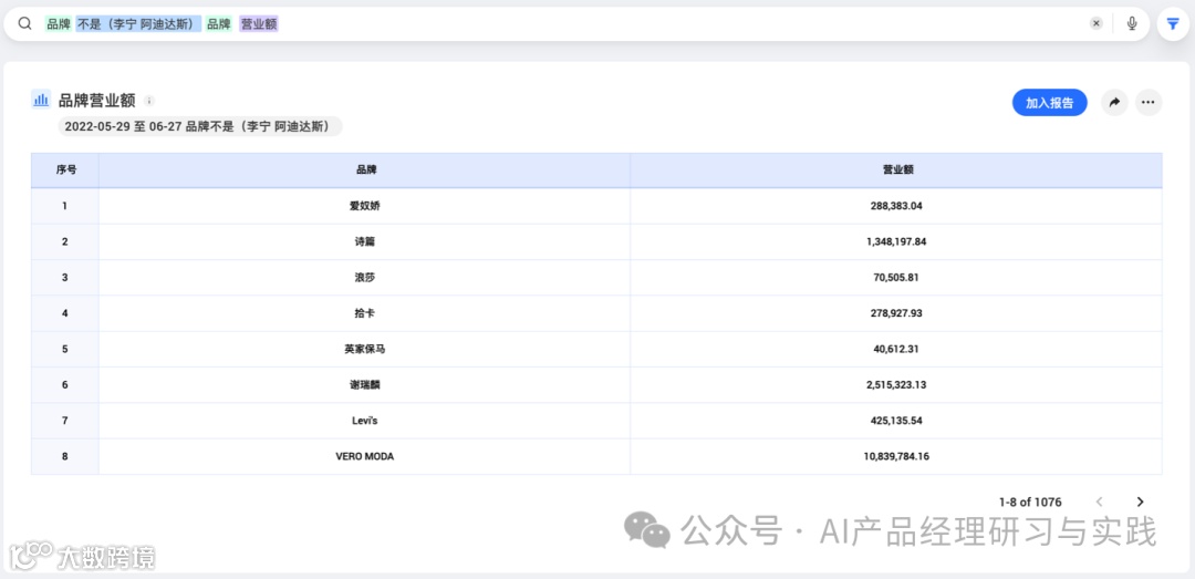 (6)品牌像(阿迪)的营业额——同样是类SQL的问法(like)↓