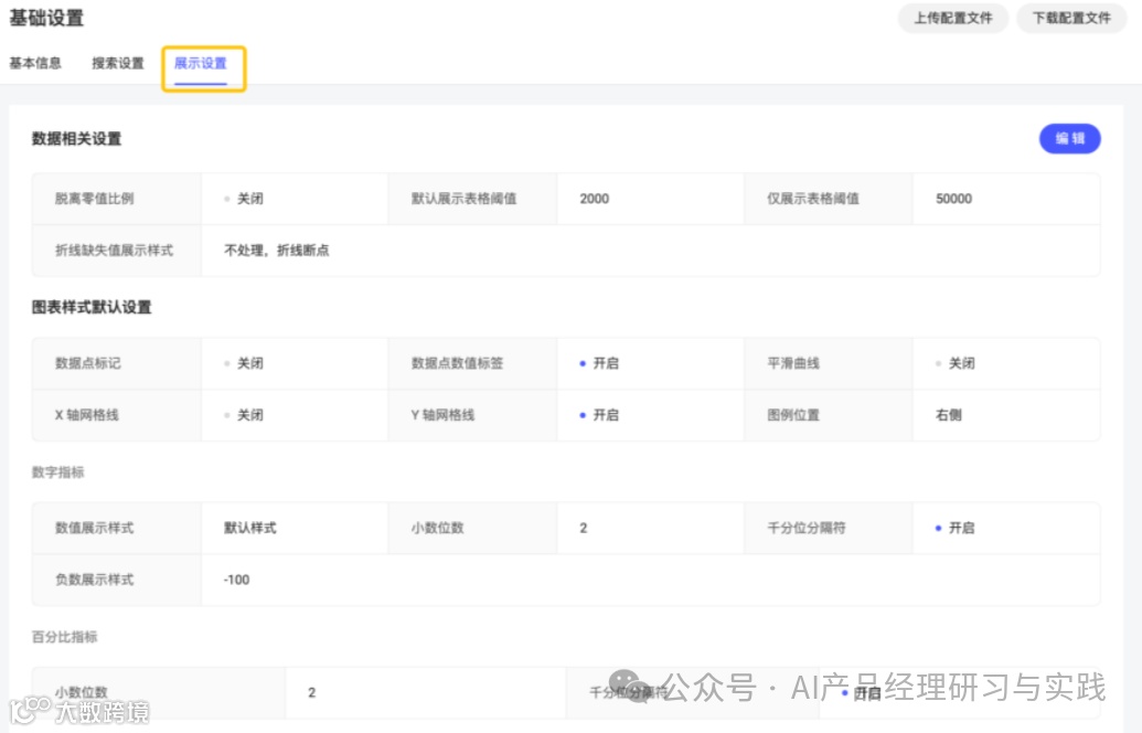 在基础设置-展示设置中,可以管理数据和图表、表格的展示效果。