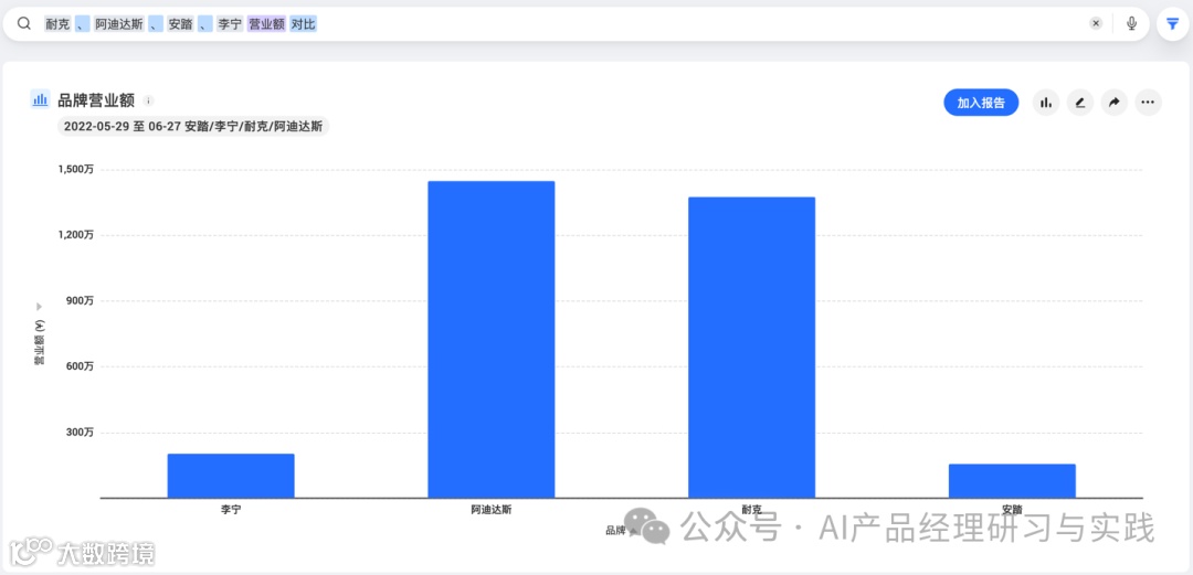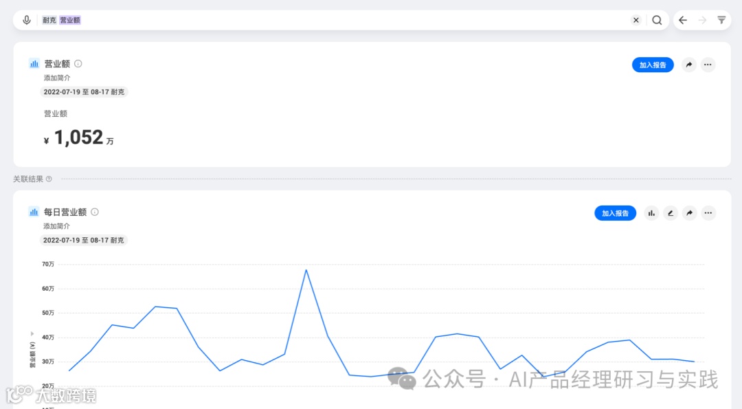 其中,“去年”为时间范围,“每季度”为第一个时间单元,“每月”为第二个时间单元,用户则可通过该问题对比耐克每个季度每个月的营业额。