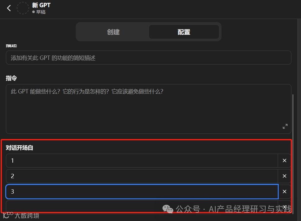 引导和推荐问题设置:用于配置新用户进入工作区时看到的引导问题,以及用户在搜索框输入时系统自动推荐的问题。这些预设问题可以帮助用户快速上手,理解系统的使用方法,并提供一些常见的业务查询示例。这和我们在自定义GPTs之类的“智能体”时也经常用到: