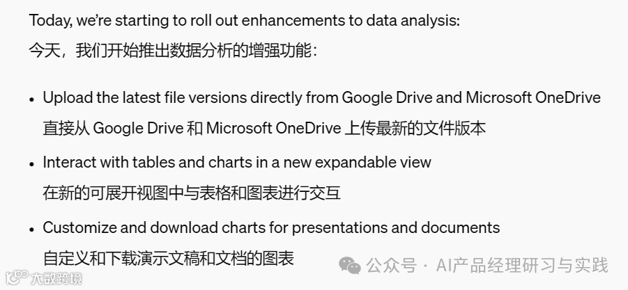 在直接上传文件的基础上,用户也可以直接从Google Drive和Microsoft OneDrive导入最新的文件版本,无需先下载到本地。这意味着ChatGPT可以更快地访问和理解Google Sheets、Docs、Slides以及Microsoft Excel、Word、PowerPoint文件。