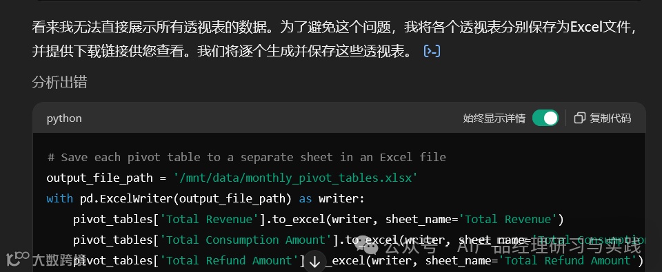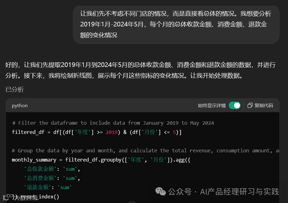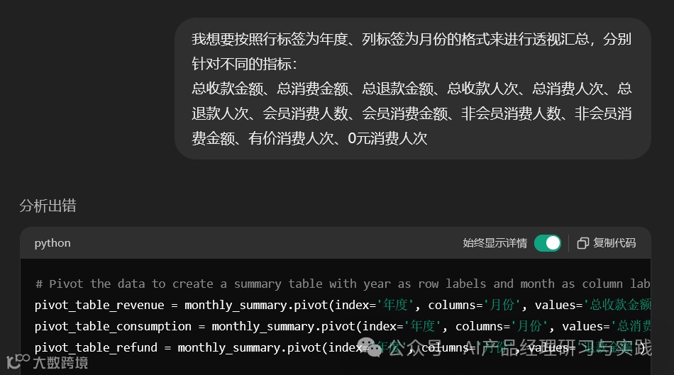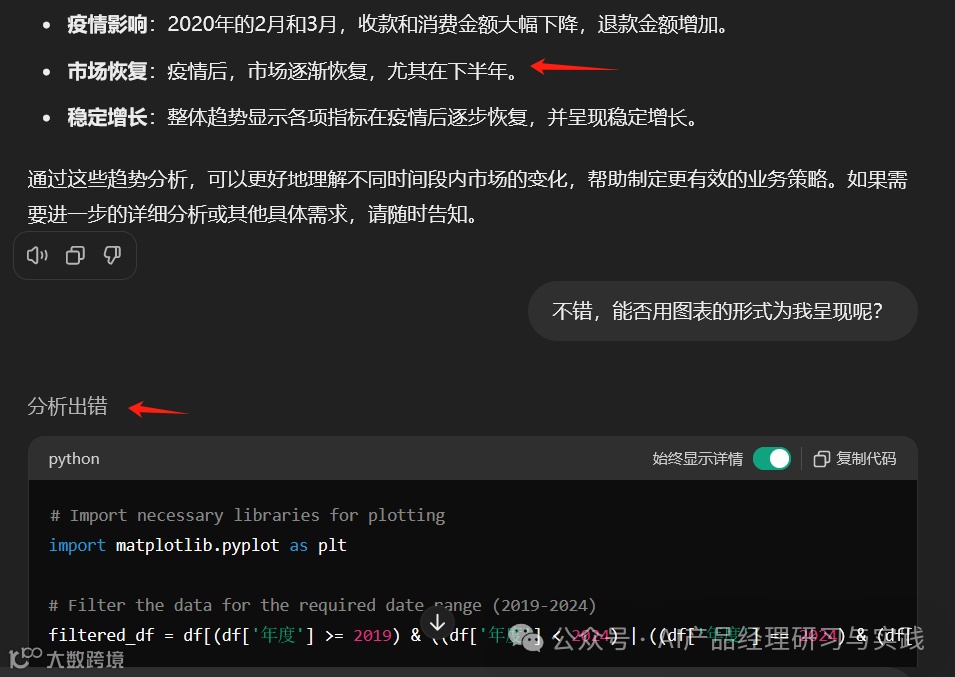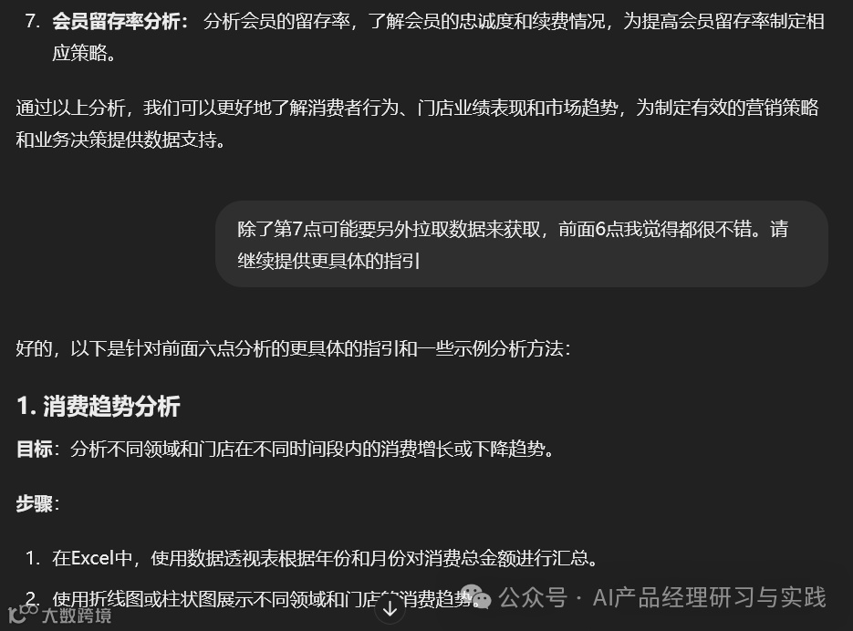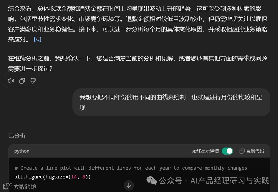接下来进行具体的交互式数据分析对话,直接把查询结果导出生成的Excel稍作整理,上传给它。