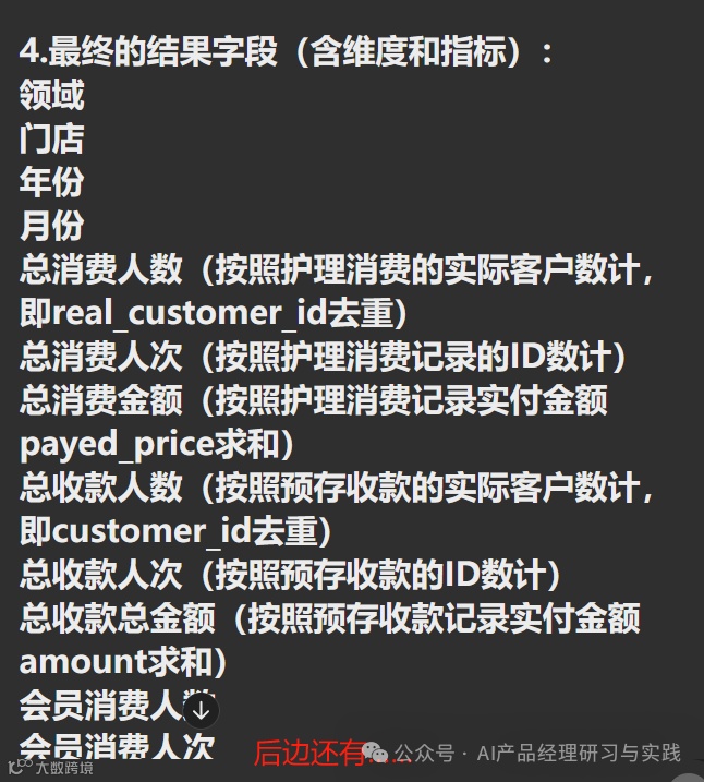 这个查询会创建一个名为 monthly_payment_summary 的表,直接汇总了按领域、门店和年月的收款数据统计,包括以下字段:年份(year)月份(month)领域ID(field_id)门店名称(shop_name)总收款人数(total_receiver_count)总收款人次(total_receiver_times)总收款总金额(total_receiver_amount)会员收款人数(member_receiver_count)会员收款人次(member_receiver_times)会员收款总金额(member_receiver_amount)非会员收款人数(non_member_receiver_count)非会员收款人次(non_member_receiver_times)非会员收款总金额(non_member_receiver_amount)通过这个汇总表,可以减少数据量,便于后续的查询和导出。