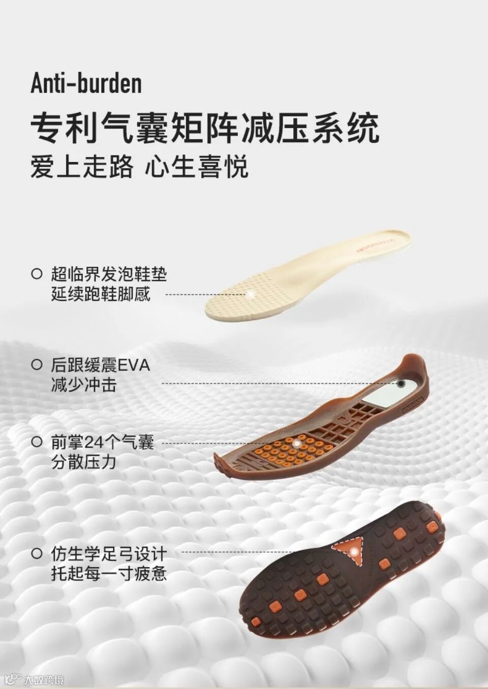 主打“科技面料”、“3倍防滑”、“防止脚塌软外翻”和“一脚蹬”。产品设计师全部来自鞋履设计世界排名第一的
