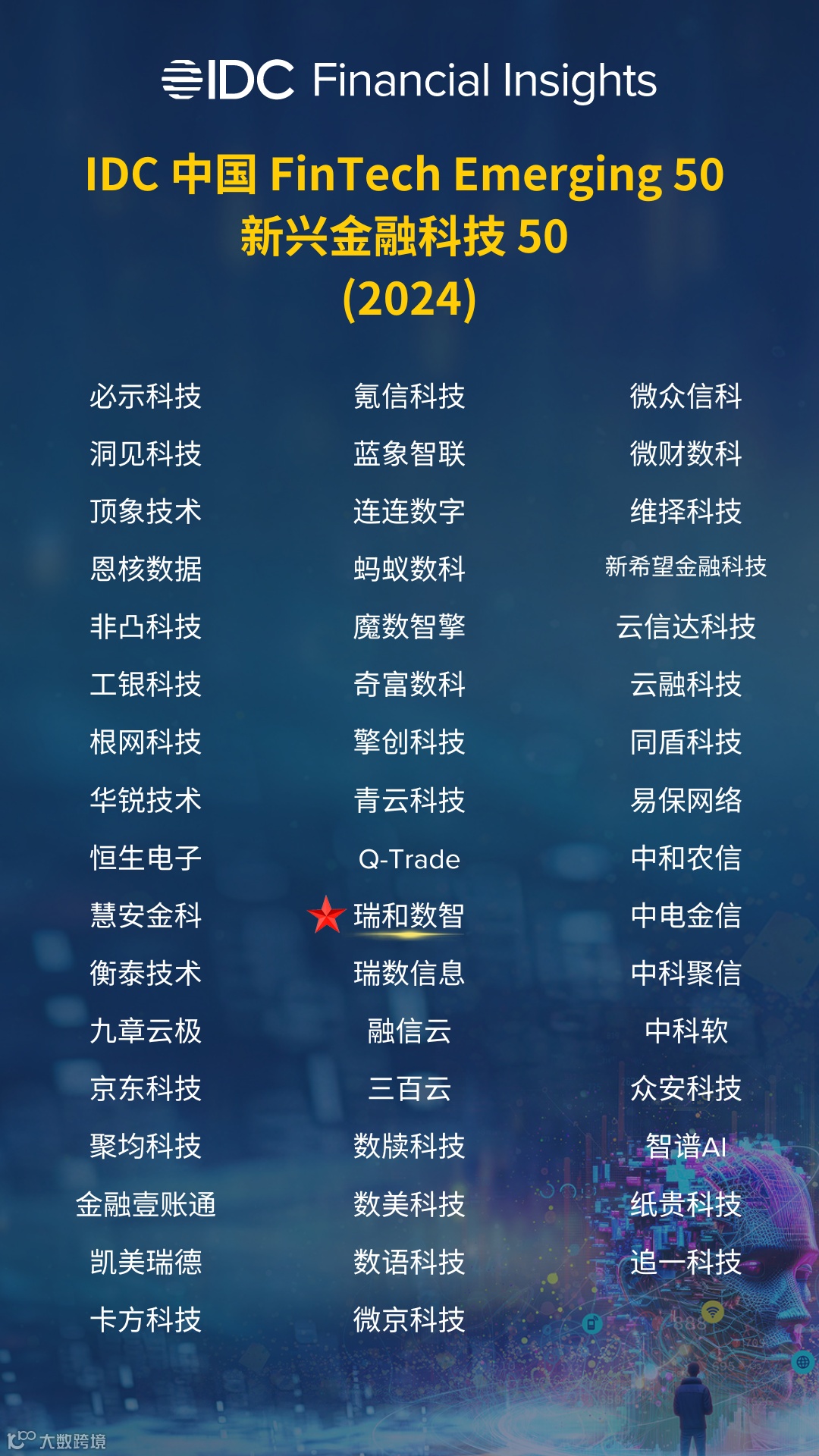 8月8日,全球领先的IT市场研究与咨询公司IDC(International Data Corporation)旗下的金融行业研究团队——IDC Financial Insights,正式揭晓了备受业界瞩目的“2024年度IDC中国新兴金融科技50榜单”(IDC China FinTech Emerging 50)。瑞和数智凭借其领先的金融科技IT解决方案、深厚的技术积累以及行业影响力成功入选“2024年度IDC中国新兴金融科技50榜单”。