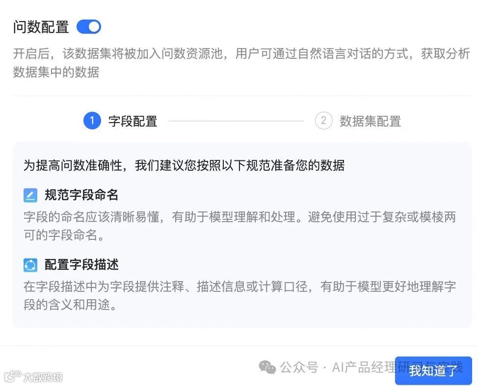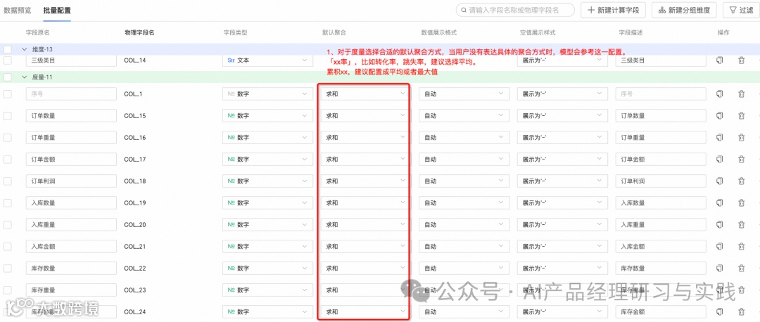 字段聚合的默认方式,如“转化率”默认选择按平均值计算,而“累计XX”默认选择平均值或最大值而非汇总。这样一来,当用户没有表达具体的聚合方式要求时,模型可参考这一配置来取数