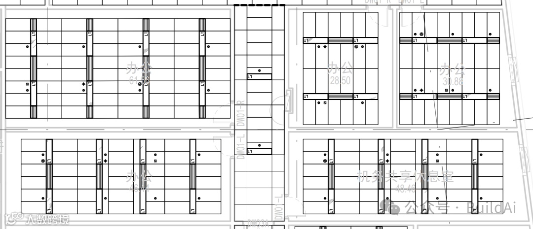 该项目办公室天花采用中间矿棉板和周边石膏板结合的吊顶形式,这种吊顶周边的石膏板具有可调节性,降低了数据的应用难度,我们仅仅通过几十个标准数据,就完成了大面积天花的自动布置。如果是单独使用矿棉板吊顶或者石膏板吊顶,也可以用这个思路来做,只是需要的数据量可能会更大。