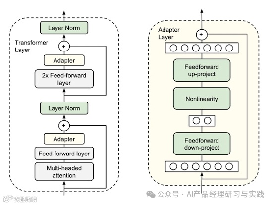 在右图中,Adapter由一个瓶颈组成,其中包含与原始模型中的注意层和前馈层相关的几个参数。适配器还包含一个跳过连接。在适配器调整期间,绿色层根据下游数据进行训练,这包括适配器、层规范化参数和最终分类层 (图中未显示)。