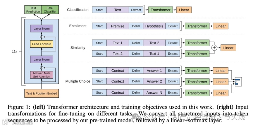 生成式预训练Transformer(GPT,纯Decoder模型)首先通过下一个标记预测在 BooksCorpus 上进行预训练。接下来是对文本分类、文本蕴含、相似性和问答等任务的单任务微调。有趣的是,他们发现将语言建模作为辅助目标有助于模型在训练过程中更快地泛化和收敛。