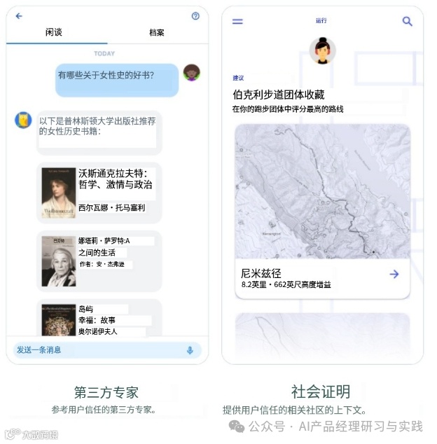 来自专家和社区的背景信息也增强了用户的信任。例如,如果用户正在寻求远足路线的推荐,提及相关社区强烈推荐的建议路线可能会大有帮助。它不仅增加了推荐的价值,还帮助用户通过人际关系校准信任。