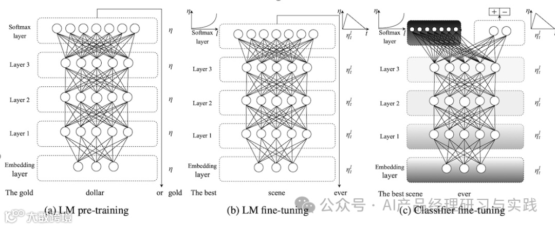 b)完整的LM微调目标任务数据,使用歧视性微调 (“Discr”)和倾斜的三角学习率(STLR)学习特定任务的功能