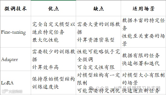以下表格对比了Fine-tuning、Adapter、LoRA三种微调技术在假设的AI产品(基于GPT-4的客户服务聊天机器人)中的应用: