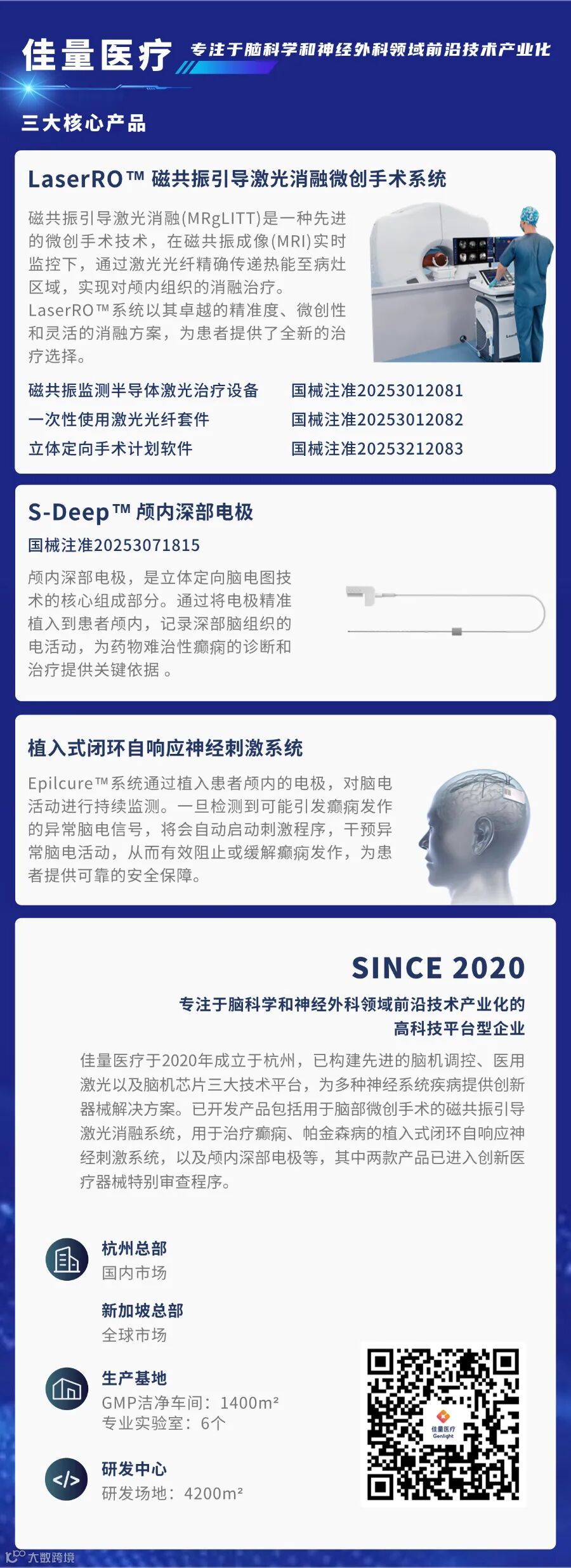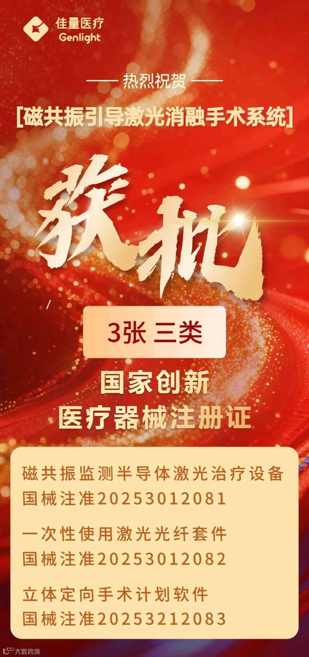 2025年10月27日,佳量医疗自主研发的三款产品:磁共振监测半导体激光治疗设备【国械注准20253012081】、一次性使用激光光纤套件【国械注准20253012082】、立体定向手术计划软件【国械注准20253212083】通过国家药品监督管理局审批,获得第三类国家创新医疗器械注册证。