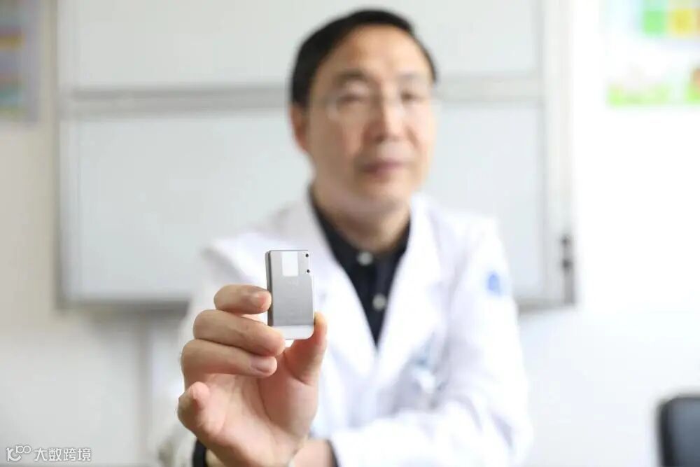 朱君明展示闭环神经刺激器实物,其长、宽、高分别为52毫米、28毫米、6.5毫米。(新华社记者 黄筱 摄)
