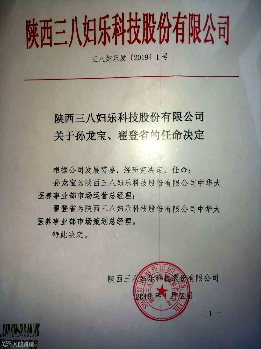 根据陕西三八妇乐科技股份有限公司发展需要,经研究决定,任命: