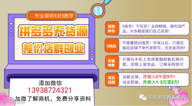 拼多多软件招商代理,拼多多网店无货源模式,不需要囤货,发货,开门面,装修,一系列高额投入,风险更低。自己注册网店需要电脑,兼职/创业赚钱。全程指导,可实地考察!更有代运营模式,一个人全职去做可以轻松经营20家店铺,收益大化,兼职创业项目,轻松当老板!
